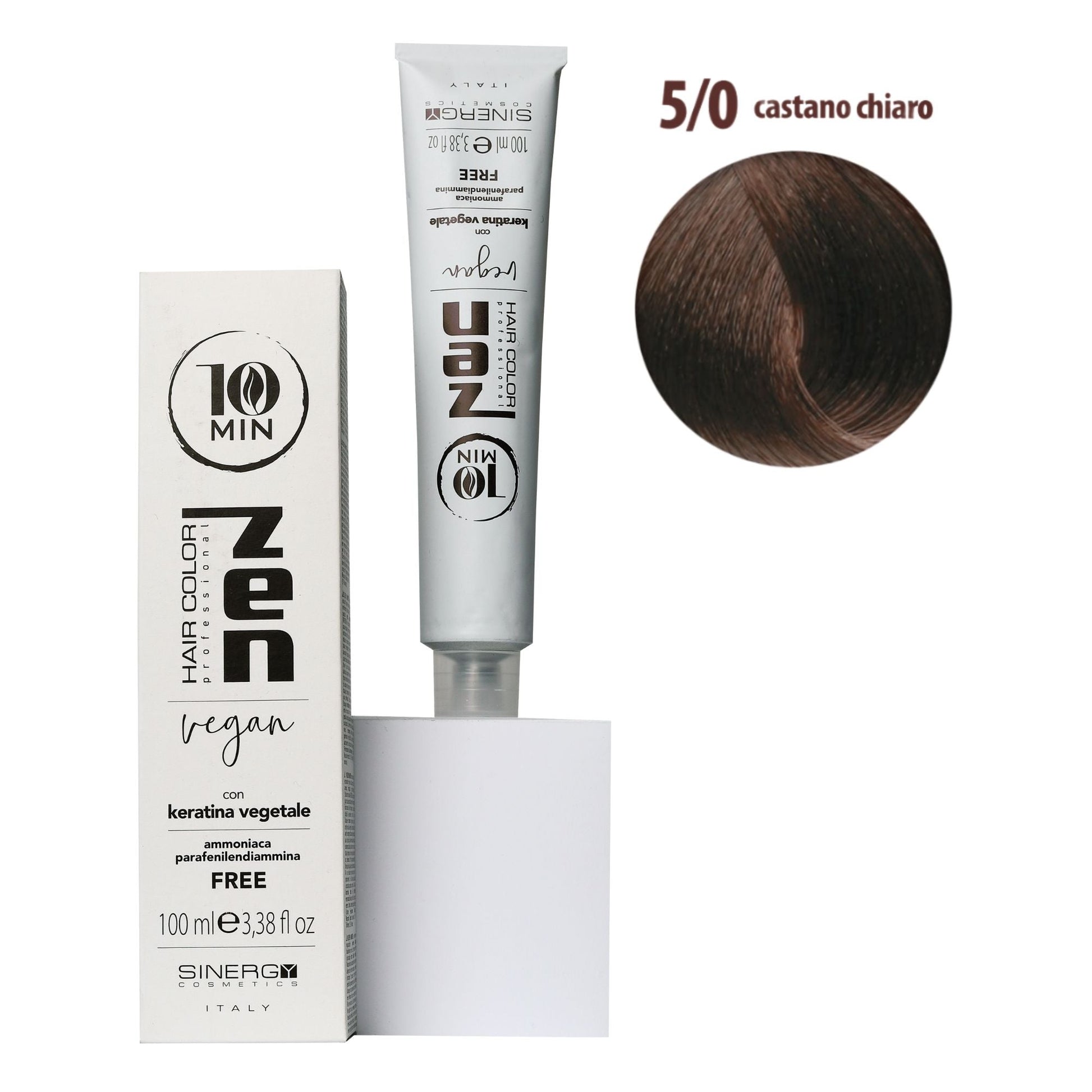 Крем-фарба для волосся Sinergy Zen 10 min 5/0 , 100мл - фантастична парфумована крем-фарба з рослинними амінокислотами (рослинним кератином), без аміаку та парафенілендіаміну. ЇЇ інноваційна, унікальна у світі формула забезпечує якісне фарбування в рекордно короткі строки. Дивовижні результати та приголомшливий блиск усього за 10 хв. Крем-фарба для волосся Sinergy Zen 10 min - сприяє забезпеченню рівномірного покриття кольором та результату високої стійкості.Унікальна мультивалентна система фарбування волосся відрізняється глибиною та інтенсивністю одержуваних відтінків та блиском здорового волосся. У складі цінні натуральні компоненти (олія асаї, гідролізована кіноа, олія насіння соняшнику,екстракт органічної бавовни), що захищають структуру волосся і захищають від втрати вологи, що перешкоджають подразненню шкіри голови.
